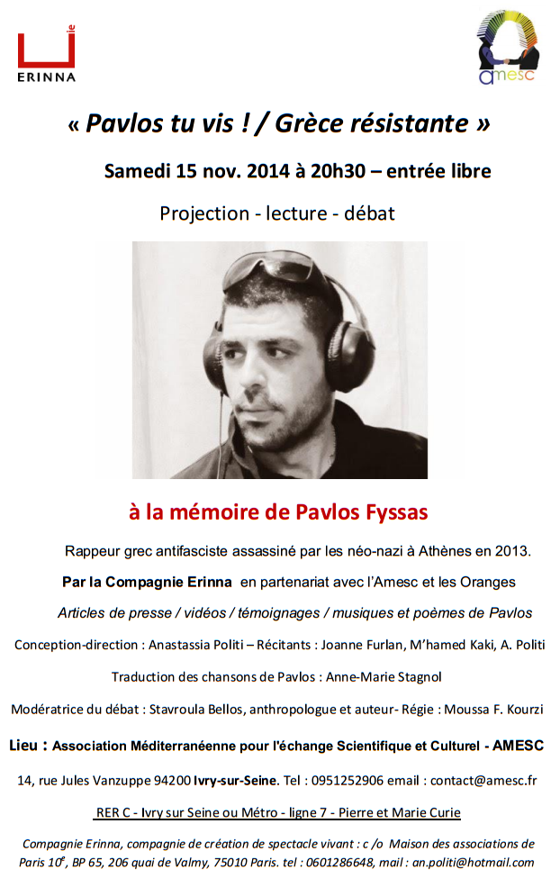 Soirée à la mémoire de Pavlos Fyssas par la Companie Erinna