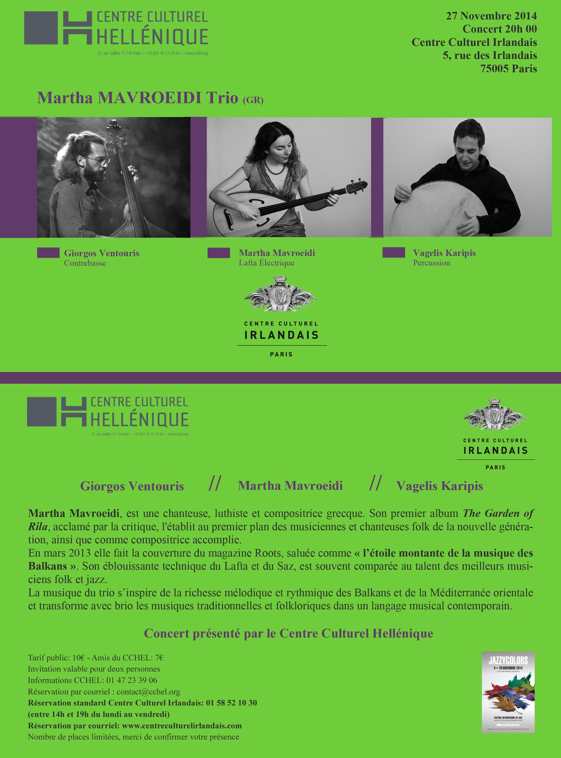 Réservation standard Centre Culturel Irlandais: 01 58 52 10 30(entre 14h et 19h du lundi au vendredi)