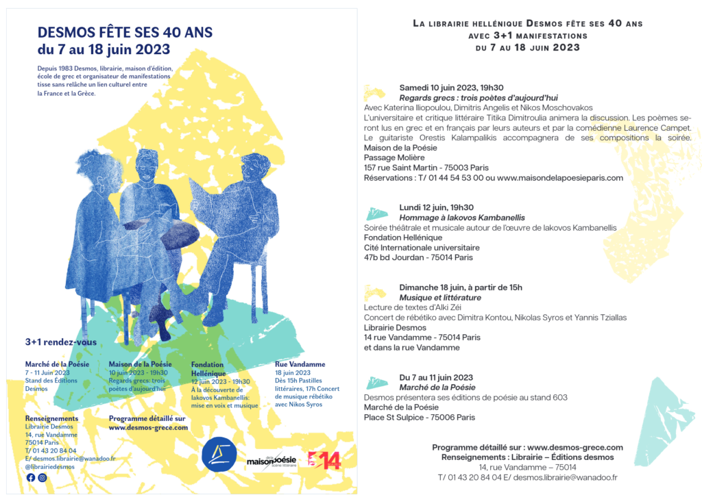 Au programme : À partir de 15h Laurence Campet et Dimitra Kontou liront des extraits de poétesses et écrivaines grecques. Ensuite, à partir de 17h Antonis Kalomenos, Dimitra Kontou, Nicolas Syros et Yannis Tziallas offriront un concert de rébétiko devant la librairie.