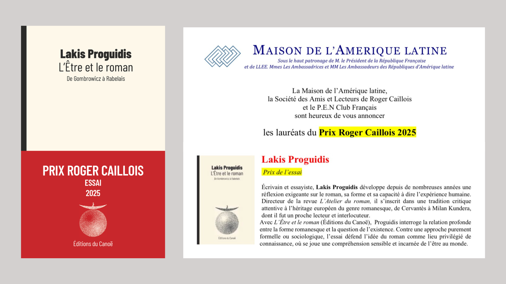 Remise du Prix Roger Caillois 2025 à l’écrivain Lakis Proguidis pour son livre « L’Être et le roman »